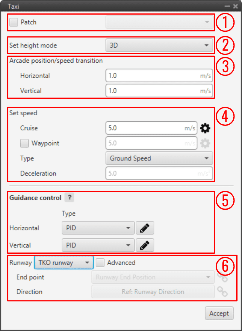 Taxi guidance is used to create a linear path along the runway that is followed by the aircraft. This command is normally used in the take-off phase, where the airplane is wanted to keep the direction of the runway while is accelerating until the lift-off point.