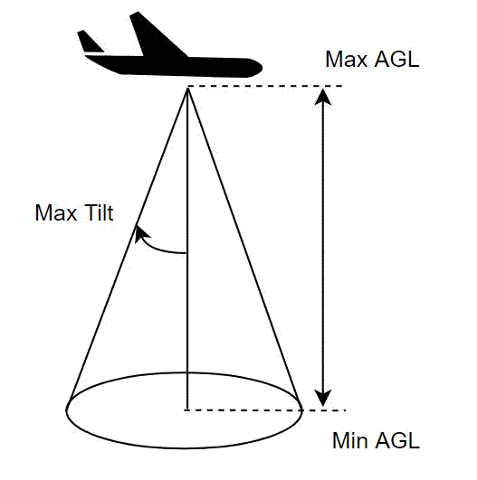 The following figure shows a diagram with the values of maximum and minimum sensor limits altitude, and the maximum tilt angle.