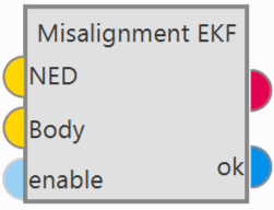 Misalignment block transforms from two vectors expressed in NED and body frames to EKF misalignment data for attitude correction.