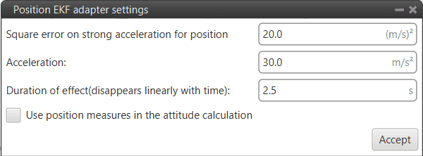 - Square error on strong acceleration for position: Under strong acceleration the variance for the position solution is changed to the specified value.