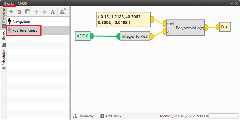 To convert the input ADC value to the physical variable it represents, the user needs to create a new program. See more information about programs in the Block Programs section of this manual.