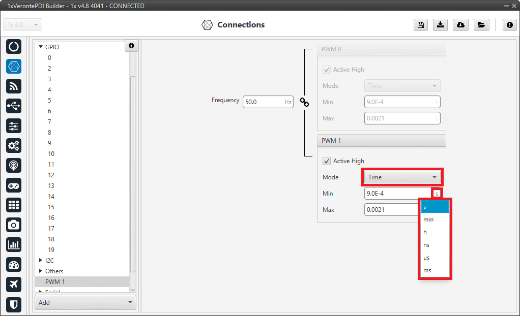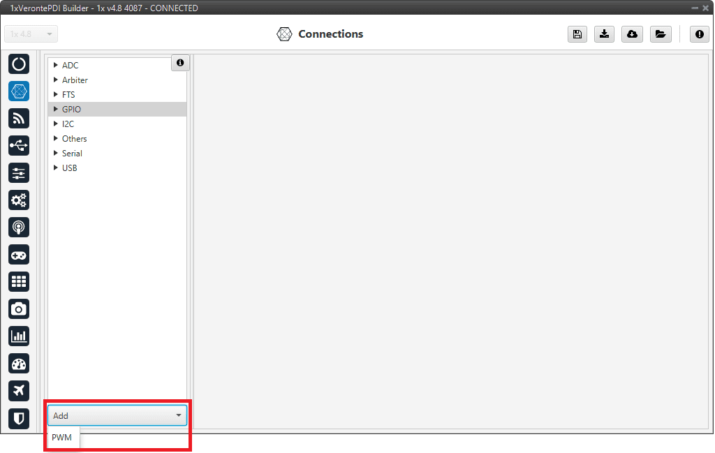 By default, all PWM/GPIO pins are configured as GPIO output. So, to configure them as PWM, it is necessary to click Add: