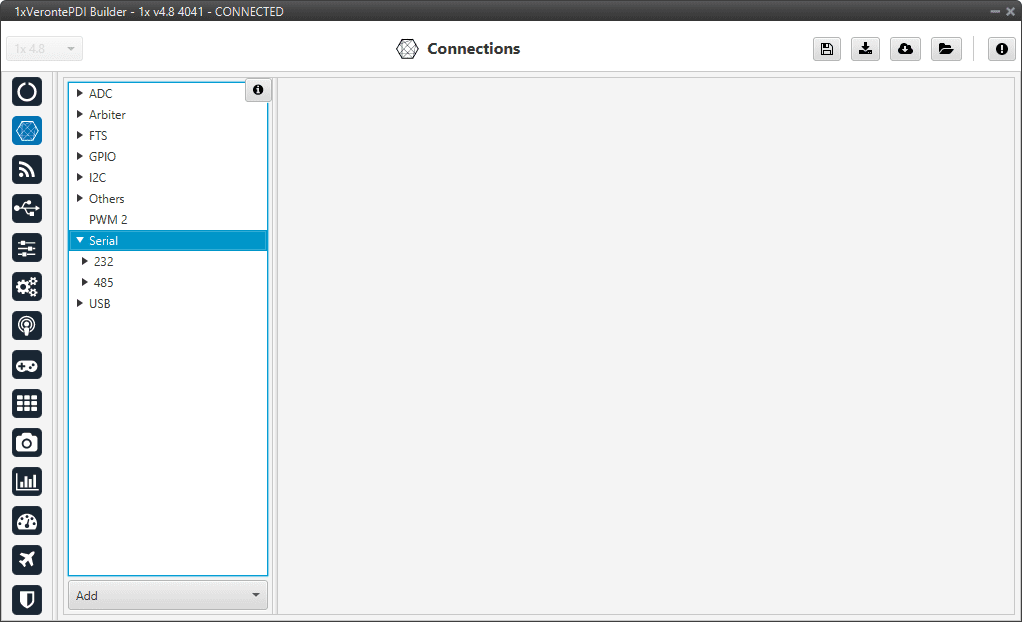 Two serial interfaces are available with Autopilot 1x, 1 port RS-232 and 1 port RS-485, however more can be added by using a CEX or MEX. Each one of the serial interfaces is associated with a set of pins. To configure these serial ports, go to Serial panel in the Input/Output menu.