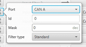 • Input filter: CAN input filters. Those CAN messages received in one filter can no longer be received in subsequent filters. Input filter must be configured in the configuration button ( gears icon), a pop-up window will appear: