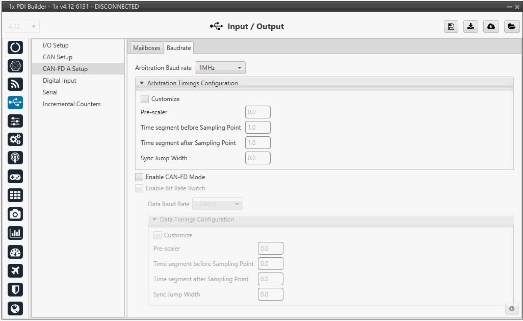 Main screen to configure the baudrate and reception mailboxes of the CAN-FD A bus.