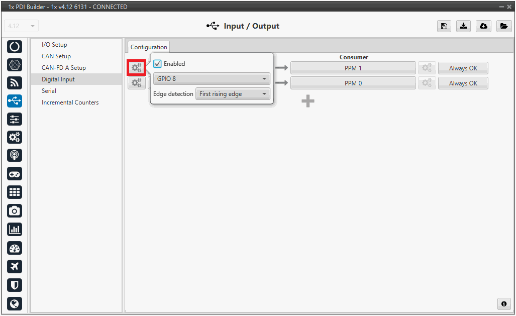 Digital Input panel - Edge detection option - First rising edge: With this option, when the rise of the pulse is detected, the data will start to be stored. Recommended when consumer is PPM or Pulse.