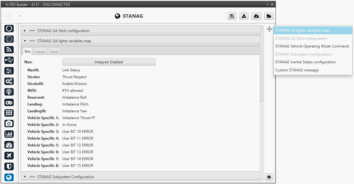 The STANAG panel is used to configure various communication messages, which represent the primary protocol for the autopilot's interactions. This interface allows the user to integrate specific messages one by one, making the process completely transparent within the firmware.