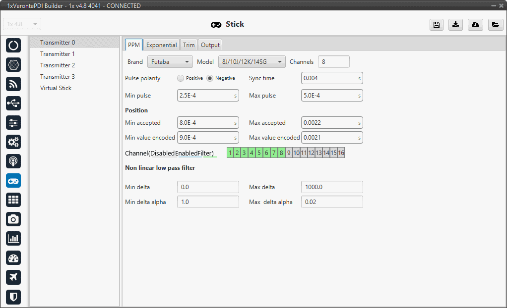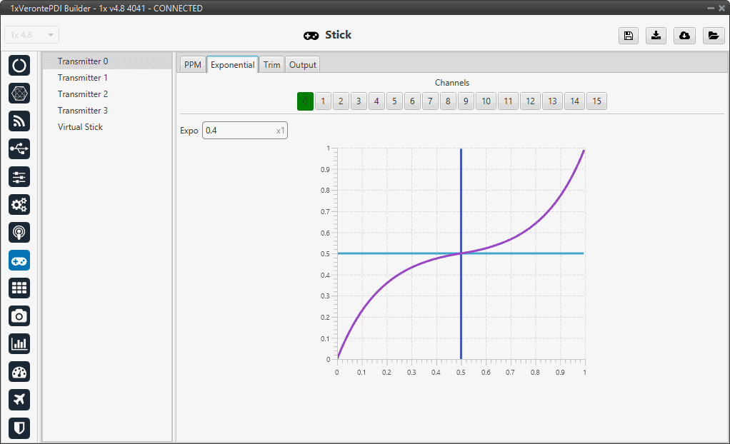The second panel allows the user to define an exponential stick response for every channel.