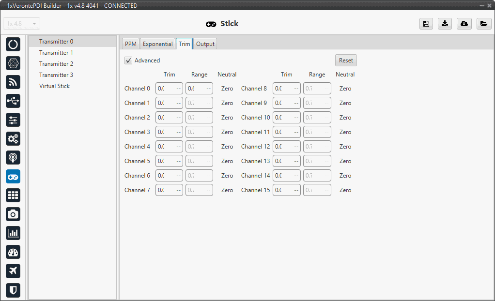 By enabling the Avanced option, the user can set the expected trim values manually. The user should have a deep knowledge on its transmitter if this option is selected.