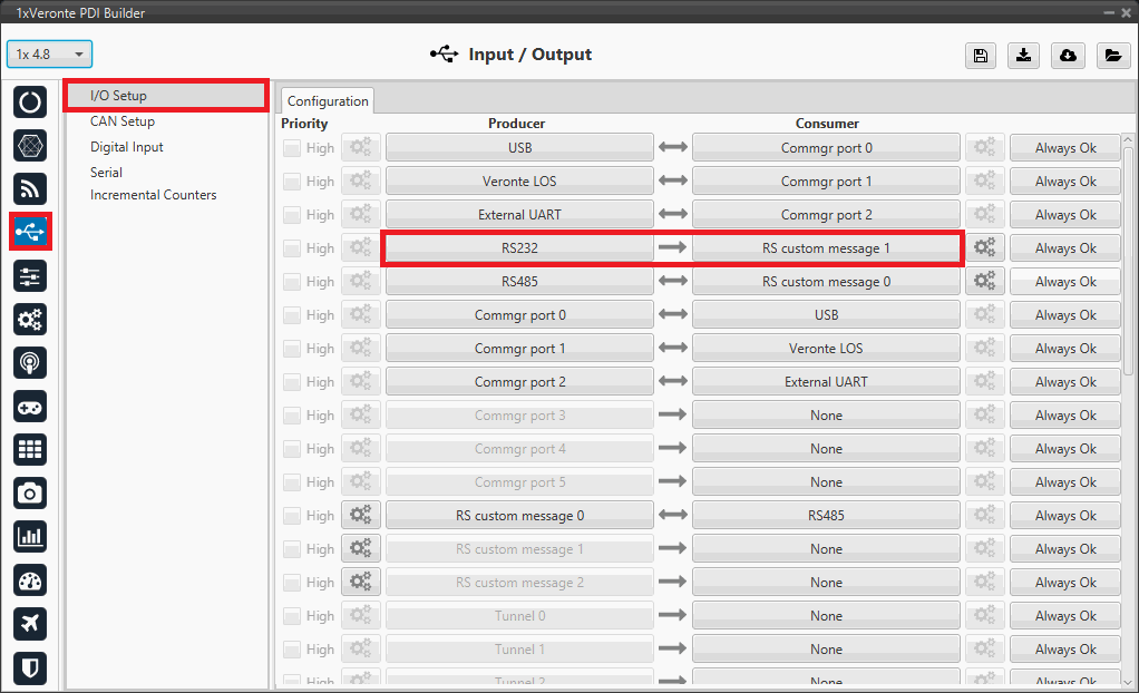Connect the RS232 producer to a RS custom message consumer, in this example RS custom message 1 is used: