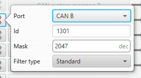 In addition, this Input filter is configured to take data from Port CAN B, with Id 1301, Mask 2047 and Standard as Filter type.