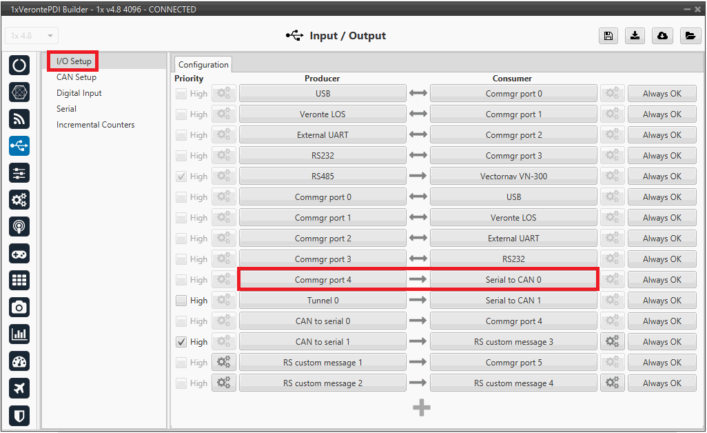 In this example, CAN to serial 0 producer is connected to Commgr port 4 consumer, and Commgr port 4 producer is linked to Serial to CAN 0 consumer.