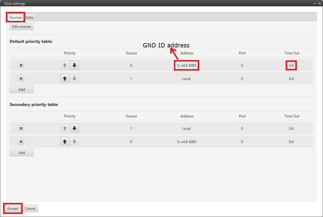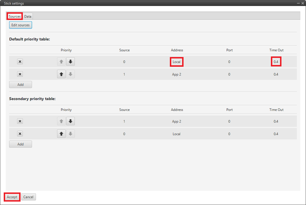 Input the address as Local to receive the stick information from that source and put it as the highest priority in the priority table. We recommend a Time Out of 0.4 s.