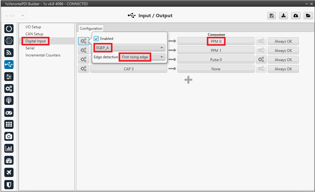 Transmitter 0 is configured since the consumer PPM 0 has been chosen in the Digital Input panel.