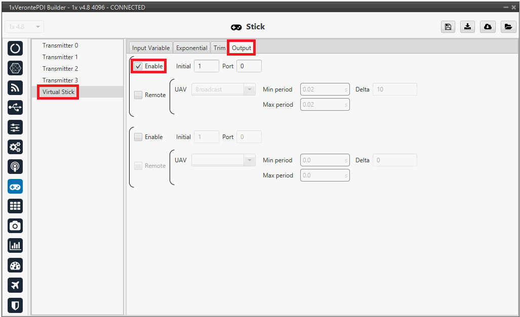 Click on Enable and on Remote to send the stick information to the air unit. Please check the recommended values for the configurable parameters described in the Ouput - Stick section of this manual.