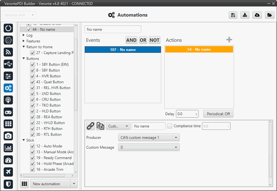 When this action is triggered, a previously configured CAN message is sent through the CAN bus. The message has to be configured in Custom message panel of the Input/Output menu.