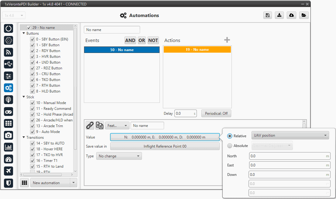 When this action is triggered, a position is stored in the desired variable. This position can be absolute or relative (in the figure below the current position of the aircraft would be saved):
