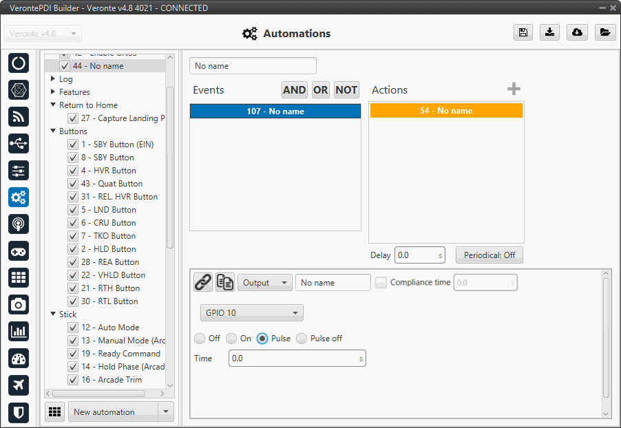 The user can select, in the drop-down menu, between a GPIO output or a virtual output. The virtual option works like a normal GPIO output, but physically this output is not in the autopilot. It is used, for example, with a CEX.