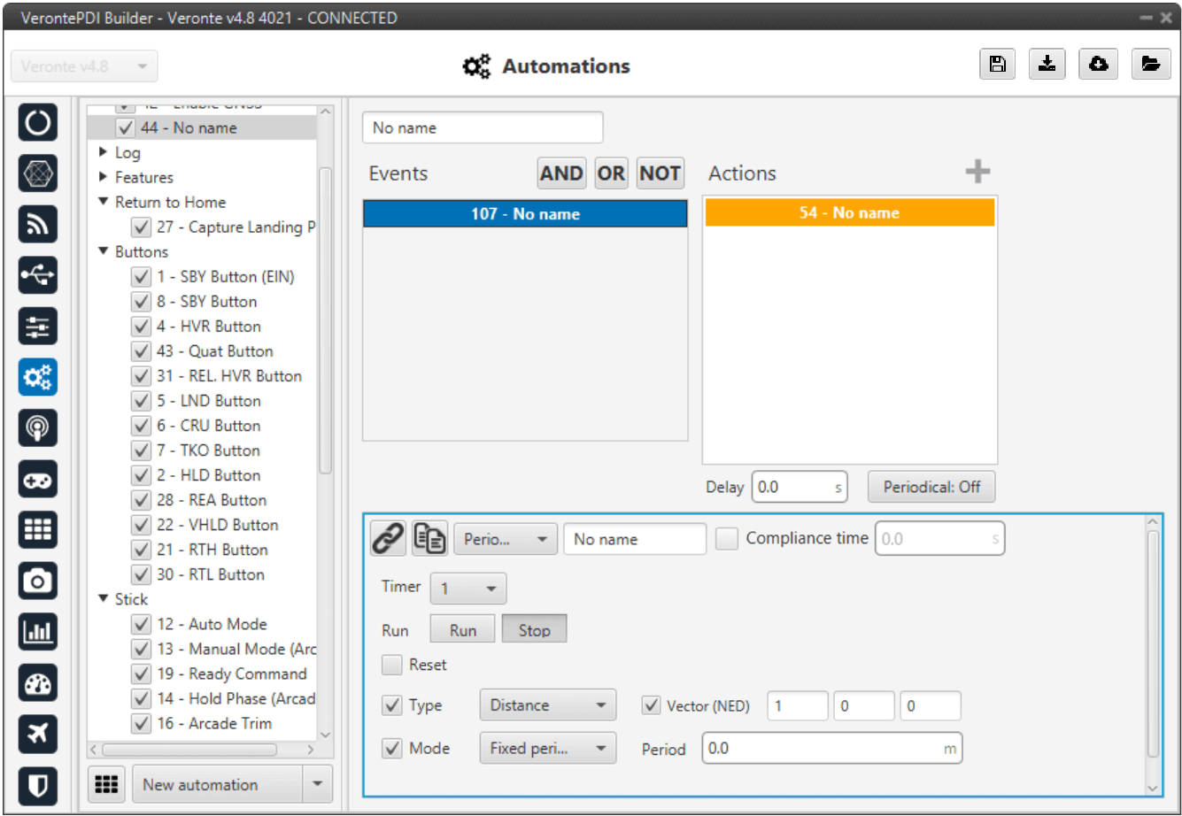 • Run + Distance/Time + Fixed Delay/Period: Once the action has been triggered, the timer will start to measure a distance/time. Each time the value indicated in Period is reached, the event linked to this timer (in another automation) will be triggered.