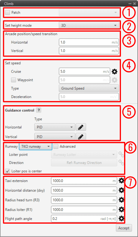 Climb guidance is used to make the aircraft climb from the start of the phase to another altitude. Commonly, this guidance is used after the take-off to fly from the ground to cruise altitude through a loiter point, but it can be employed for other purposes.