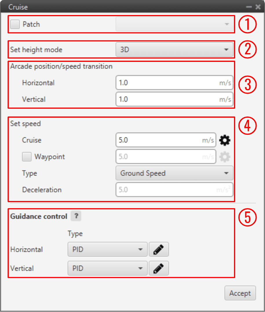 - Cruise: Lets the user set the velocity modulus of the guidance. This velocity can be slightly modified by the autopilot control algorithms.