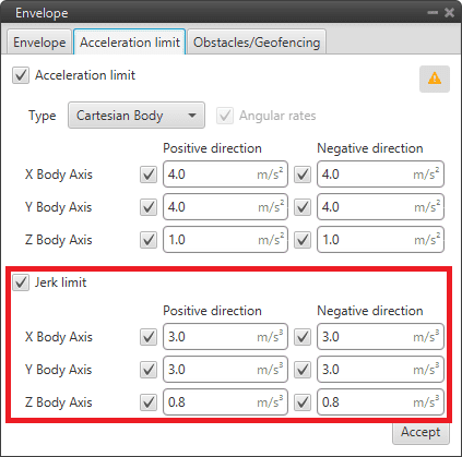 - Deceleration: This can only be configured when Waypoint option is enabled. Maximum allowed acceleration/deceleration to meet the desired velocity.