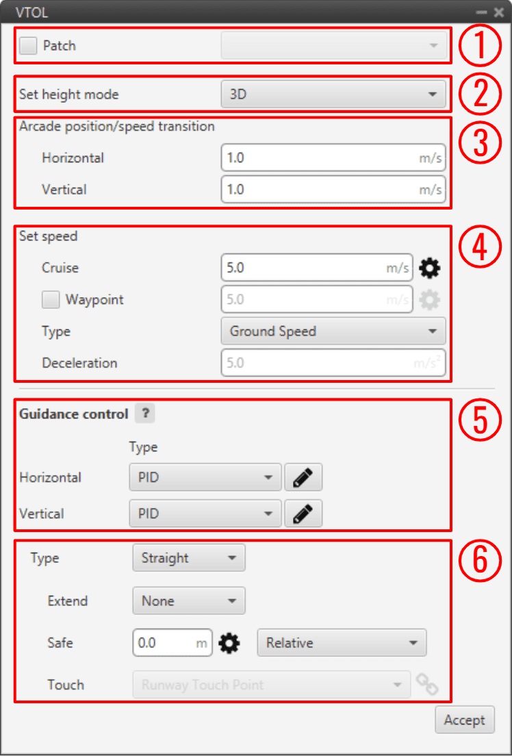 Type: These parameters are used to indicate how the multicopter follows the route during the take-off and landing.