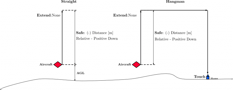 Touch: Additional parameter to be configured when the type Hangman is selected. It defines a point that the aircraft has to reach. For instance, after go Up/Down the set value, the aircraft will perform an horizontal movement according to the defined point. Finally, when the aircrafts is over the point, it will descend until reaches that point.