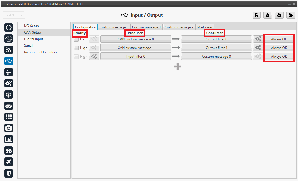 In this panel, the user can find the same 'columns' (Priority, Producer, Consumer and Always ok) as in the I/O Setup panel. In addition, the process for configuring producers and consumers is also the same as described in the I/O Setup - Input/Output section.
