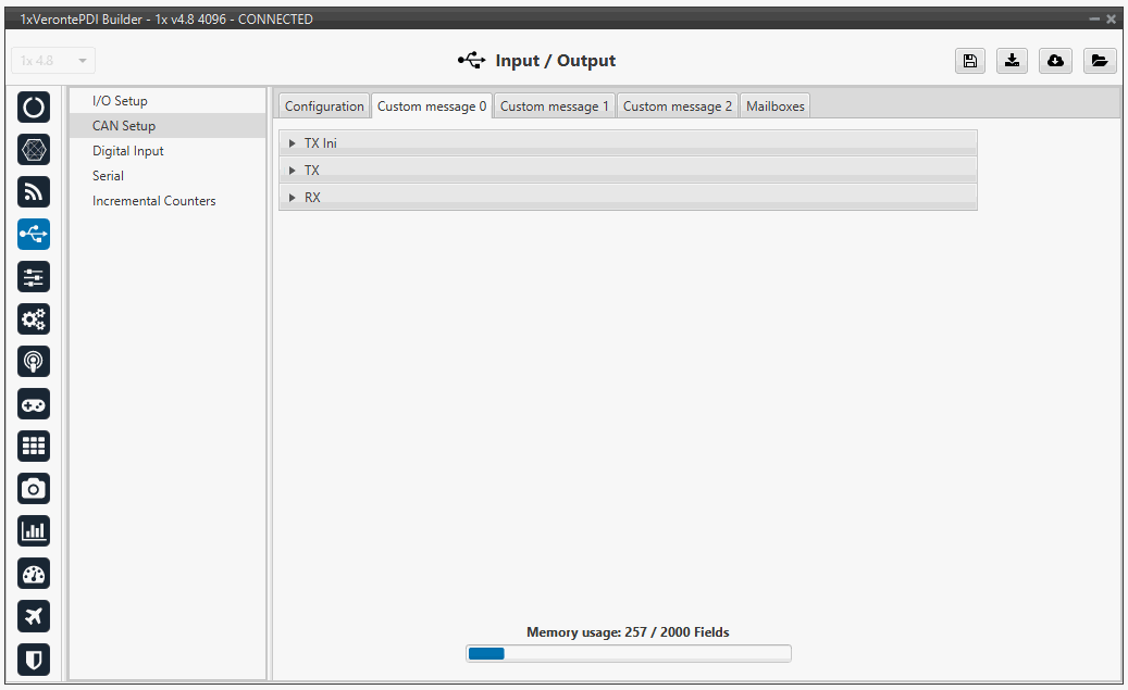 In the custom message tabs (there are 3 available), the user chooses the variables to be sent/received over the CAN buses. The following elements can be configured: