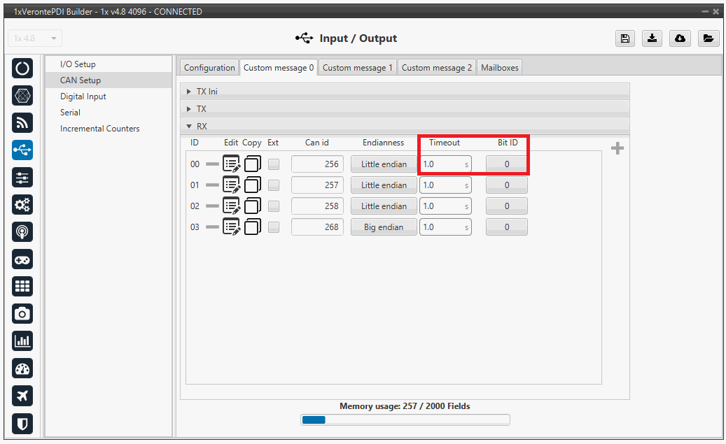 Time out: for RX messages. This is the threshold time between receptions to consider that it is not being received correctly. For example, if time out is set to 1s and it passes more than 1s since the last reception, the Bit ID will be set to false.