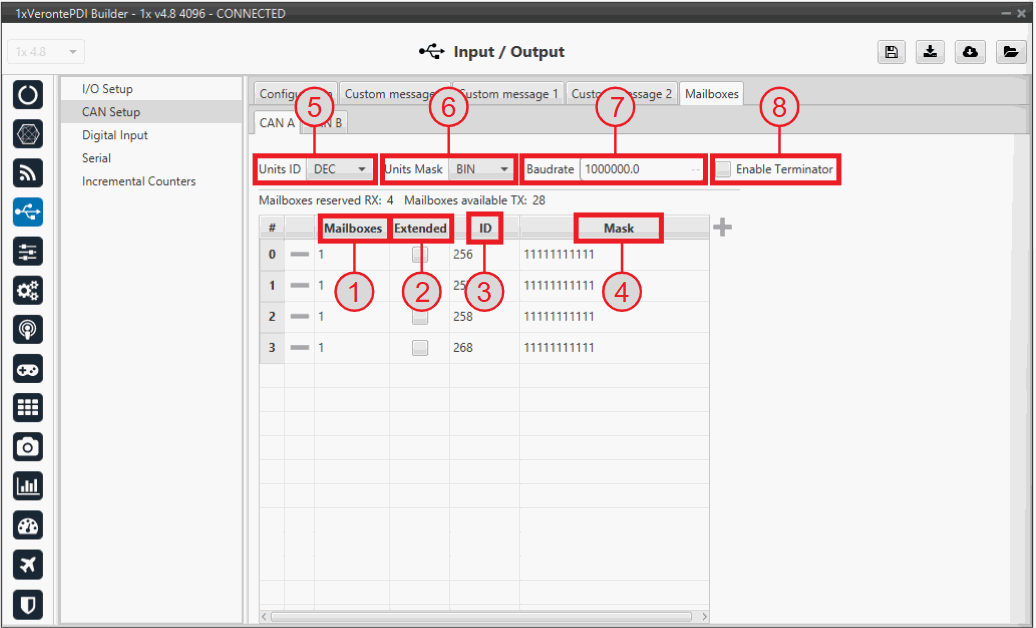 Since Veronte Autopilot 1x is going to receive data on the CAN Bus, it is mandatory to configure a certain number of mailboxes to store that data until Autopilot 1x reads it. A mailbox can be configured for multiple CAN message IDs as long as the mask is configured correctly and these messages are sent spaced out with enough time between them to allow the high priority core to read each one individually. More information on masks can be found in How to calculate a mask - FAQ section of this manual.