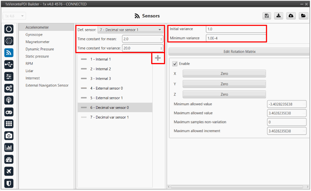 It is possible to select multiple of these sensors for the navigation algorithm, so that Veronte Autopilot 1x performs a combination of all the measurements of the selected accelerometers. This combination consists of calculating the means and variances of each of these accelerometers in a given time (time constant for mean and time constant for variance) to obtain a mean weighted with the inverse of the variance. The lower the variance, the greater the weight of that sensor in the mean.