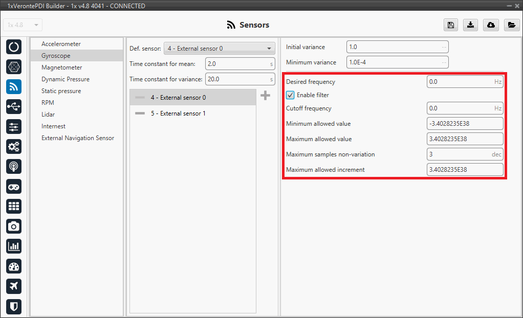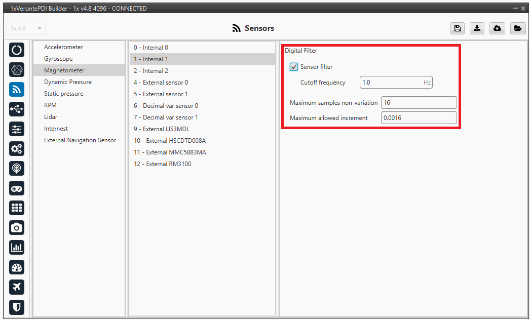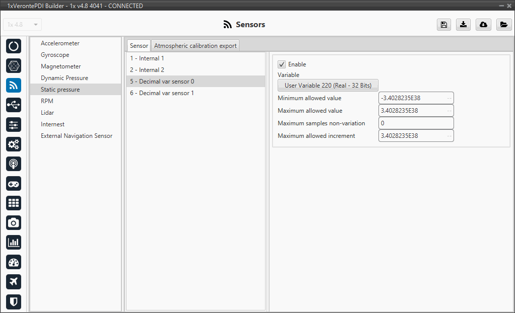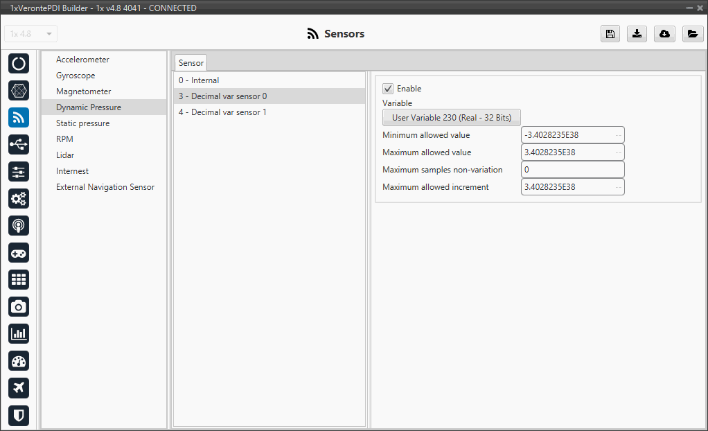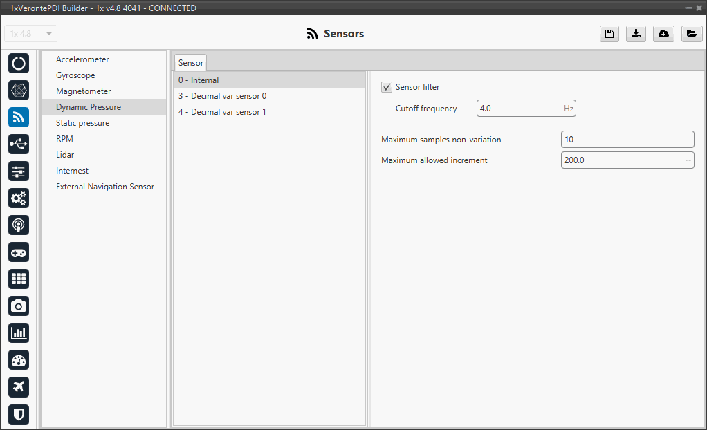 Sensors menu allows to configure any external or internal sensor of Veronte Autopilot 1x.