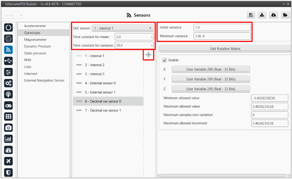 It is possible to select multiple of these sensors for the navigation algorithm, so that Veronte Autopilot 1x performs a combination of all the measurements of the selected gyroscopes. This combination consists of calculating the means and variances of each of these gyroscopes in a given time (time constant for mean and time constant for variance) to obtain a mean weighted with the inverse of the variance. The lower the variance, the greater the weight of that sensor in the mean.