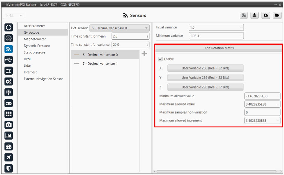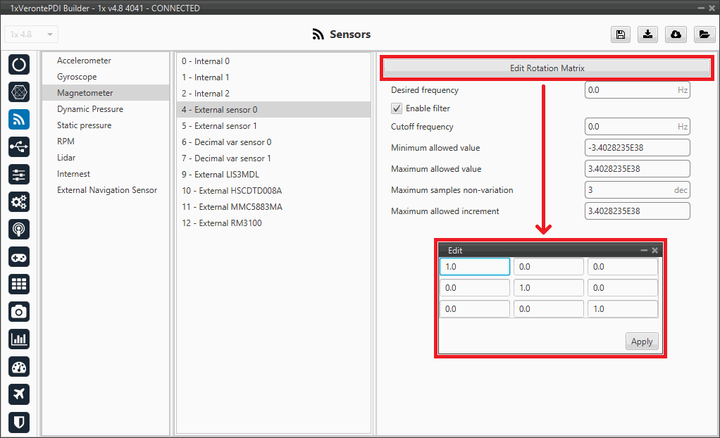 Edit Rotation Matrix: Users must set the position of the external sensor with respect to the orientation of the Veronte Autopilot 1x.