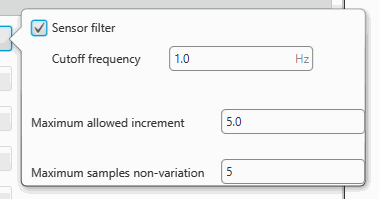 By enabling the Sensor filter checkbox, the user enables a low pass filter which its cutoff frequency is configured manually, allowing the user to input any desired value in Hz. It is a software filter.