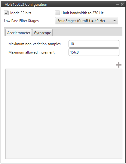 • Enable digital filter sensor: Enables a low pass filter which its cutoff frequency is configured from the options 16.65Hz, 66.6Hz, 133.2Hz and 740.0Hz.