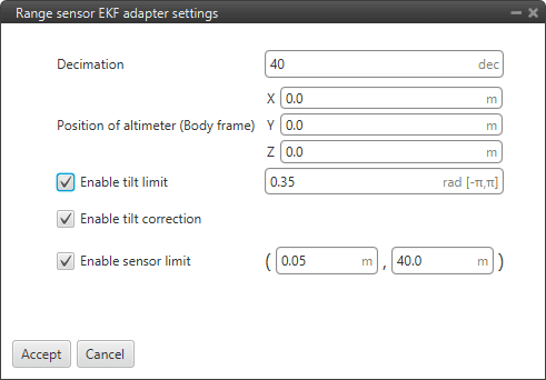 • Enable tilt limit: The altimeter is normally installed in a fixed position having a constant direction with respect to the platform. Taking a LIDAR as an example, it is used to measure altitude so it has to point towards the ground, in a direction parallel to the Z body axis. When the vehicle is not level on its X or Y axis (has a pitch or roll angle different from zero), the LIDAR will not point in a direction perpendicular to the ground, and the measurement taken will not be the real altitude of the aircraft. This option is a safe condition to discard the measure of an altimeter when its tilt angle exceeds a certain value defined here.