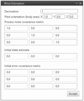 • Initial error covariance matrix: Indicates to the algorithm the confidence of the initial wind estimate provided in initial state estimate.