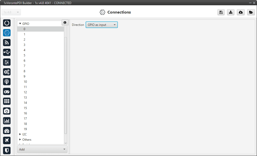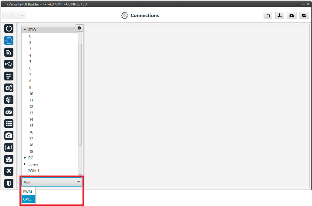 Autopilot 1x admits up to 20 I/O PWM/GPIO signals. To configure a pin as GPIO after it has been changed to PWM, click Add and select GPIO: