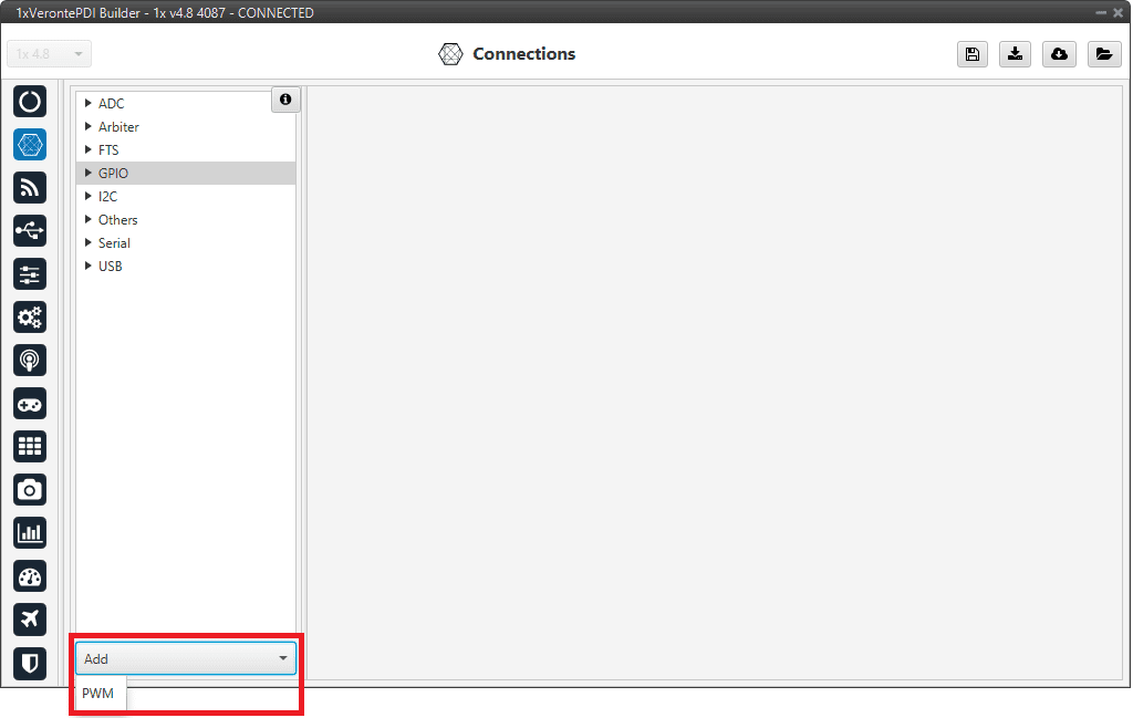 By default, all PWM/GPIO pins are configured as GPIO output. So, to configure them as PWM, it is necessary to click Add: