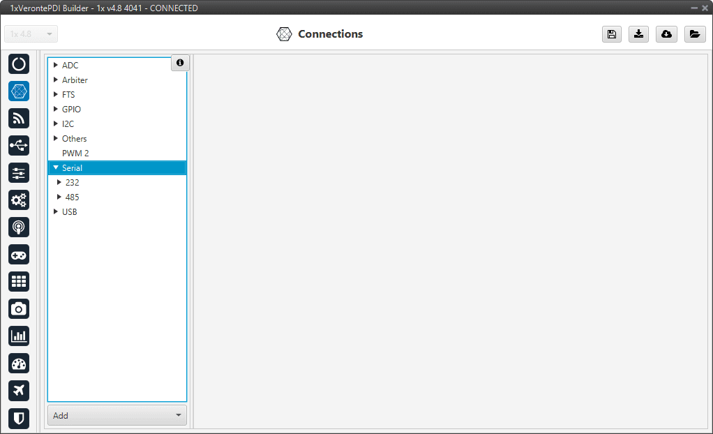 Two serial interfaces are available with Autopilot 1x, 1 port RS-232 and 1 port RS-485, however more can be added by using a CEX or MEX. Each one of the serial interfaces is associated with a set of pins. To configure these serial ports, go to Serial panel in the Input/Output menu.