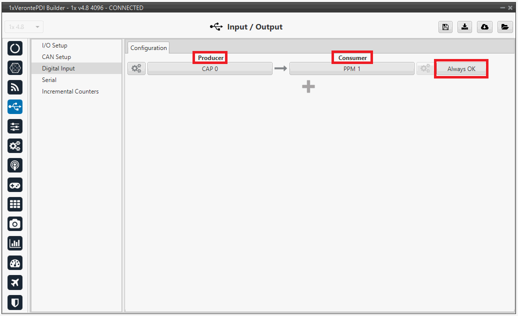 Digital inputs can be used to measure pulse count, pulse widths and PPM signals from a RC radio. Each source shall be connected to the desired consumer to allow measurements.
