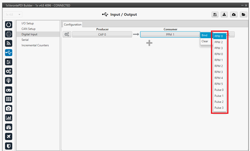 Click on the Bind button to select the type of Consumer, it is possible to choose among a PPM 0-3 (Stick PPM), RPM 0-5 (RPM sensor) or Pulse 0-3 (Pulse).