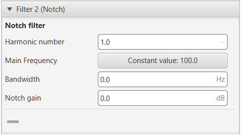 Notch filter is a filter that dampens signals only at a specific frequency. - Harmonic Number: Allows the filter to target specific harmonics of the main frequency. - Main Frequency: Main frequency (Hz) at which the notch filter reaches its maximum damping.