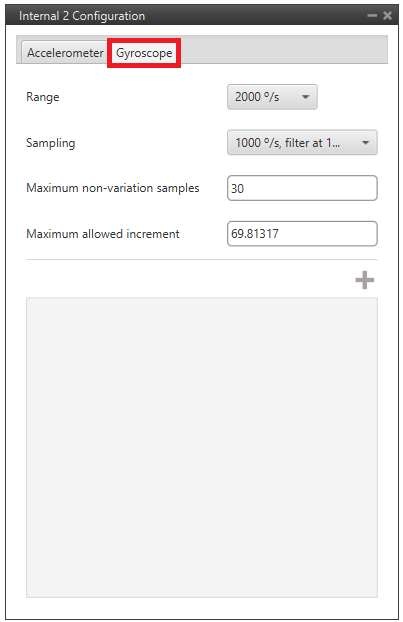 • Sampling: That is the angular velocity at which the measurements are read out. Values allowed are 100°/s filter at 32 Hz, 200°/s filter at 64 Hz, 100°/s filter at 12 Hz, 200°/s filter at 32 Hz, 400°/s filter at 47 Hz, 1000°/s filter at 116 Hz, 2000°/s filter at 230 Hz and 2000°/s filter at 532 Hz.