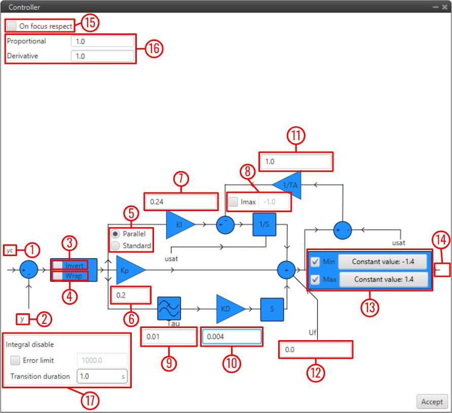 (Optional) respect: When TRUE the output 'u' is equal to the input 'usat' and the integral component is estimated with the information in 'y' and 'yc'. When FALSE the PID works as usual. If not connected a value of FALSE is assumed.