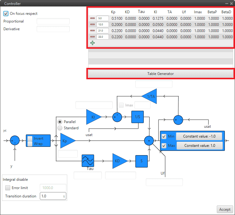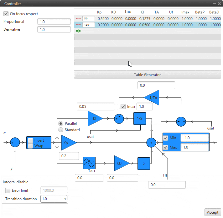 This is another option to enter the PID gains for different values of the input variable, instead of manually entering all the gains, the Table Generator will generate them according to the parameters to be configured: