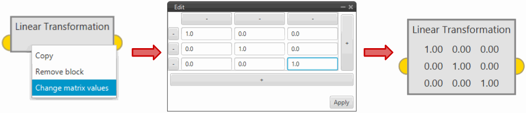 Linear Transformation: Returns the input vector multiplied by the transformation matrix. In order to edit the transformation matrix, double click on the block.